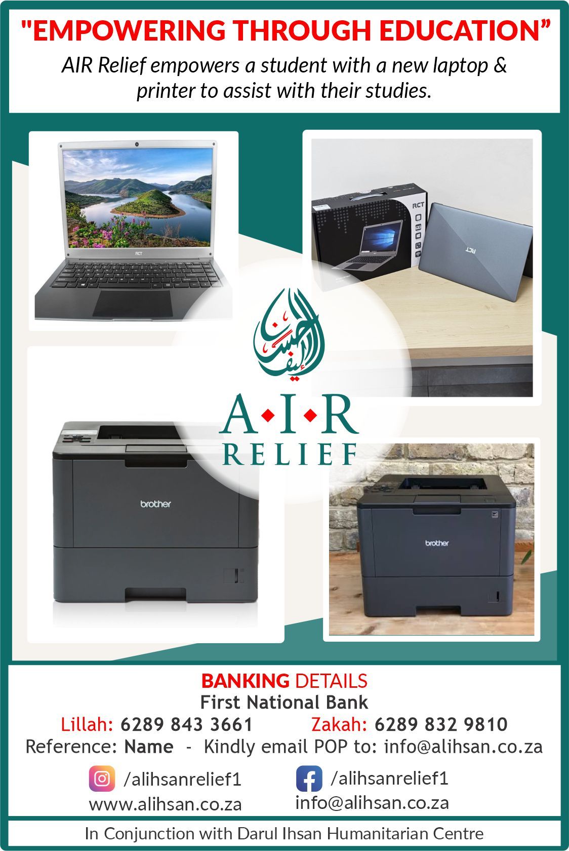Al Ihsan (AIR) Relief, A South African based NGO, was established to provide basic aid and assistance to disadvantaged communities experiencing poverty, unemployment, lack of amenities and basic services. AIR Relief has taken a mandate to respond to emergency relief in disaster areas both locally and globally.